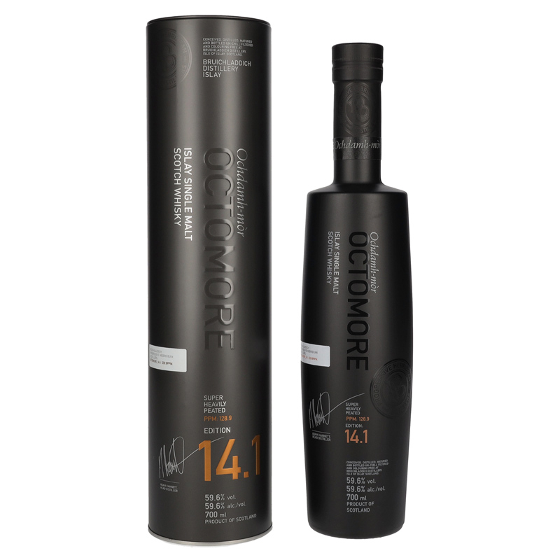 Bruichladdich Octomore 14.1 je dynamická whisky světle jantarové barvy destilovaná ze 100% skotského pevninského ječmene Concerto. Má jemnou a složitou rovnováhu mezi intenzivním kouřem, sladem, vlivem sudu a procesem zrání, vytvářející omamný zážitek z pití.