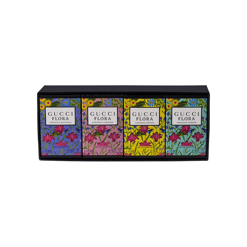Tato dárková sada obsahuje: 5ml/0,16oz Gucci Flora Gorgeous Gardenia parfémovaná voda pro ženy Miniatura, 5ml/0,16oz Gucci Flora Gorgeous Jasmine parfémovaná voda pro ženy Miniatura, 5ml/0,16oz Gucci Flora Gorgeous Magnolia parfémovaná voda pro ženy Miniatura, 5ml/0,16oz Gucci Flora Gorgeous Orchid Eau de Parfum for Women Miniatura, 5ml/0,16oz Gucci Flora Gorgeous Orchid Eau de Parfum for Women Miniatura.