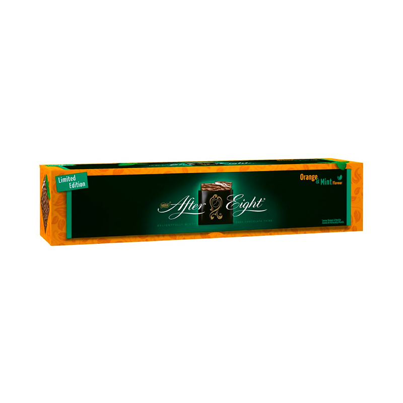 After Eight dark chocolates with pepermint filling with orange flavour přináší klasickou kombinaci jemné hořké čokolády a osvěžující mátové náplně v nové variaci s nádechem pomeranče. Tenké čokoládové plátky ukrývají lehkou krémovou náplň, která spojuje chladivou svěžest máty s jemně ovocným tónem citrusů. Výsledkem je vyvážená harmonie hořkosti, svěžesti a ovocné sladkosti.