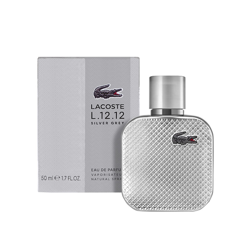 L.12.12 Silver Grey se stříbrným kovovým povrchem, který vzdává hold ocelové tenisové raketě René Lacoste, doplňuje legendární kolekci parfémů inspirovanou polo se zářivou elegancí.