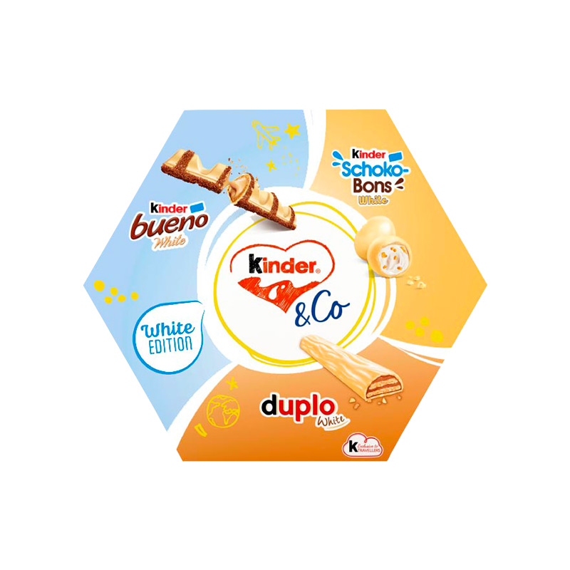 bílá čokoláda 28 % (kakaové máslo, cukr, sušené odstředěné MLÉKO, koncentrované MÁSLO, emulgátor: lecitiny (SÓJA), aroma: vanilin), cukr, palmový olej, PŠENIČNÁ mouka, sušené odstředěné MLÉKO, sušené MLÉKO, LÍSKOVÉ OŘECHY (5 %), syrovátkový prášek (MLÉKO), PŠENIČNÝ škrob, kakao se sníženým obsahem tuku, slunečnicový olej, MLÉČNÉ bílkoviny, emulgátor: lecitiny (SÓJA), kypřicí látky (hydrogenuhličitan amonný, hydrogenuhličitan sodný), aromata, sůl. Celkové mléčné složky: 21,5 % DUPLO WHITE Oplatka (7 %) s lískovooříškovou náplní (17 %), vrstva (26 %) s bílou čokoládou, vše potažené bílou čokoládou (49,5 %). Složení: bílá čokoláda 74 % (sušené odstředěné MLÉKO, kakaové máslo, cukr, koncentrované MÁSLO, emulgátor: lecitiny (SÓJA); vanilin), cukr, PŠENIČNÁ mouka, LÍSKOVÉ OŘECHY (4 %), palmový olej, SYROVÁTKOVÝ prášek, PŠENIČNÝ škrob, kakao se sníženým obsahem tuku, sůl, kypřicí látka (hydrogenuhličitan sodný), emulgátor: lecitiny (SÓJA), vanilin. Může obsahovat: MANDLE. KINDER SCHOKO-BONS WHITE Kousky z bílé čokolády s mléčnou náplní (42,5 %) a lískovými oříšky. Složení: bílá čokoláda 50,5 % (sušené odstředěné MLÉKO, kakaové máslo, cukr, koncentrované MÁSLO, emulgátor: lecitiny (SÓJA); vanilin), cukr, sušené odstředěné MLÉKO (13,5 %), palmový olej, LÍSKOVÉ OŘECHY (5,8 %), koncentrované MÁSLO, lešticí látka (arabská guma), glukózový sirup, emulgátor: lecitiny (SÓJA), vanilin. Celkový obsah mléčných složek: 36 %